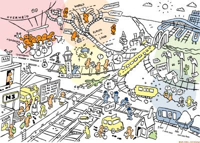 Soms wil je wel eens wat anders zien dan een PowerPoint-presentatie, en soms heb je een spreker die het ook echt anders doet. Onderstaande praatplaat is pas nog gebruikt in plaats van PowerPoint. De spreker kon zijn verhaal illustreren aan de hand van … één illustratie. Daar was dan ook wel het nodige in verwerkt, zoals u ziet.