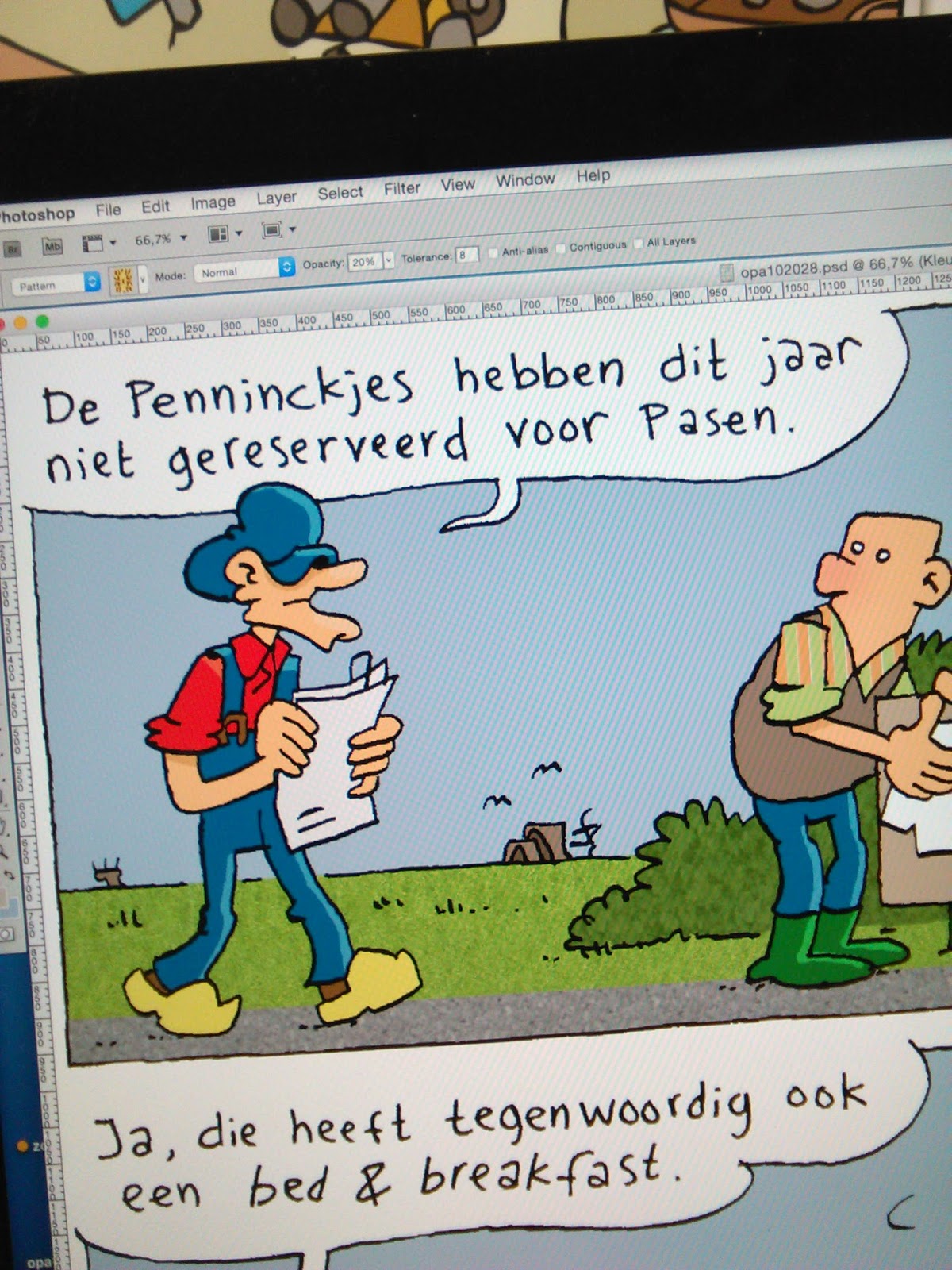 Op Instagram plaats ik, als ik er aan denk, een foto van het eerste plaatje van de aflevering van Opa waar ik op dat moment aan werk. Soms is dat nog maar een scenarioschets, soms een potloodtekening, soms een geïnkte tekening, en soms een gekleurde tekening in Photoshop. Met de relevante hashtags #opaboerderij en #eersteplaatje, en al naar gelang de verschijningsvorm #schets, #potlood, #inkt en #photoshop, en eventueel nog een hashtag over het onderwerp.