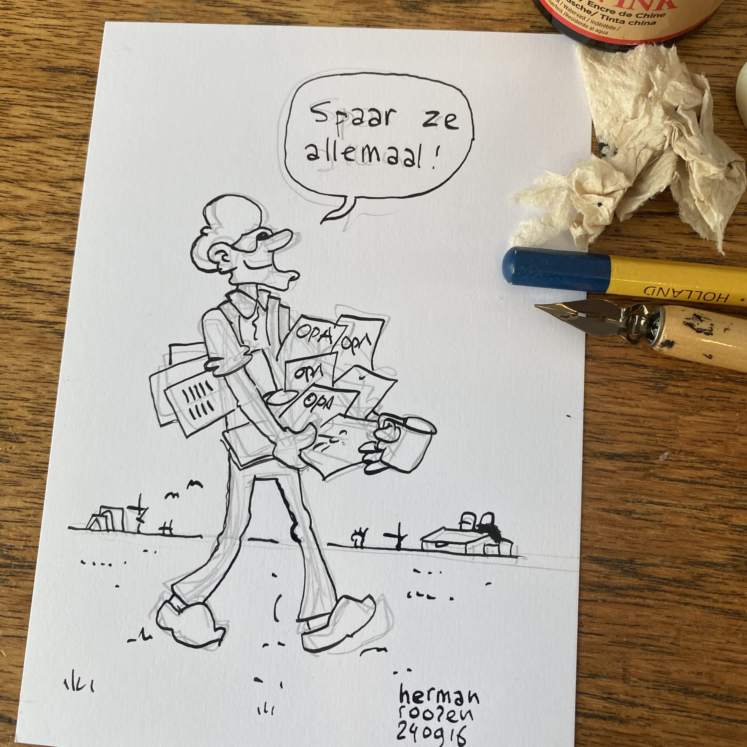 Op de ATH tekende ik Opa voor bezoekers. Niet iedereen kon daar bij zijn, dus gisteren deed ik de actie nog eens dunnetjes over op Facebook. Dat heb ik geweten. Opa-fans buitelden over elkaar heen met verzoekjes. Die kon ik niet allemaal honoreren. Misschien ook wel, maar soms heb ik andere dingen te doen.