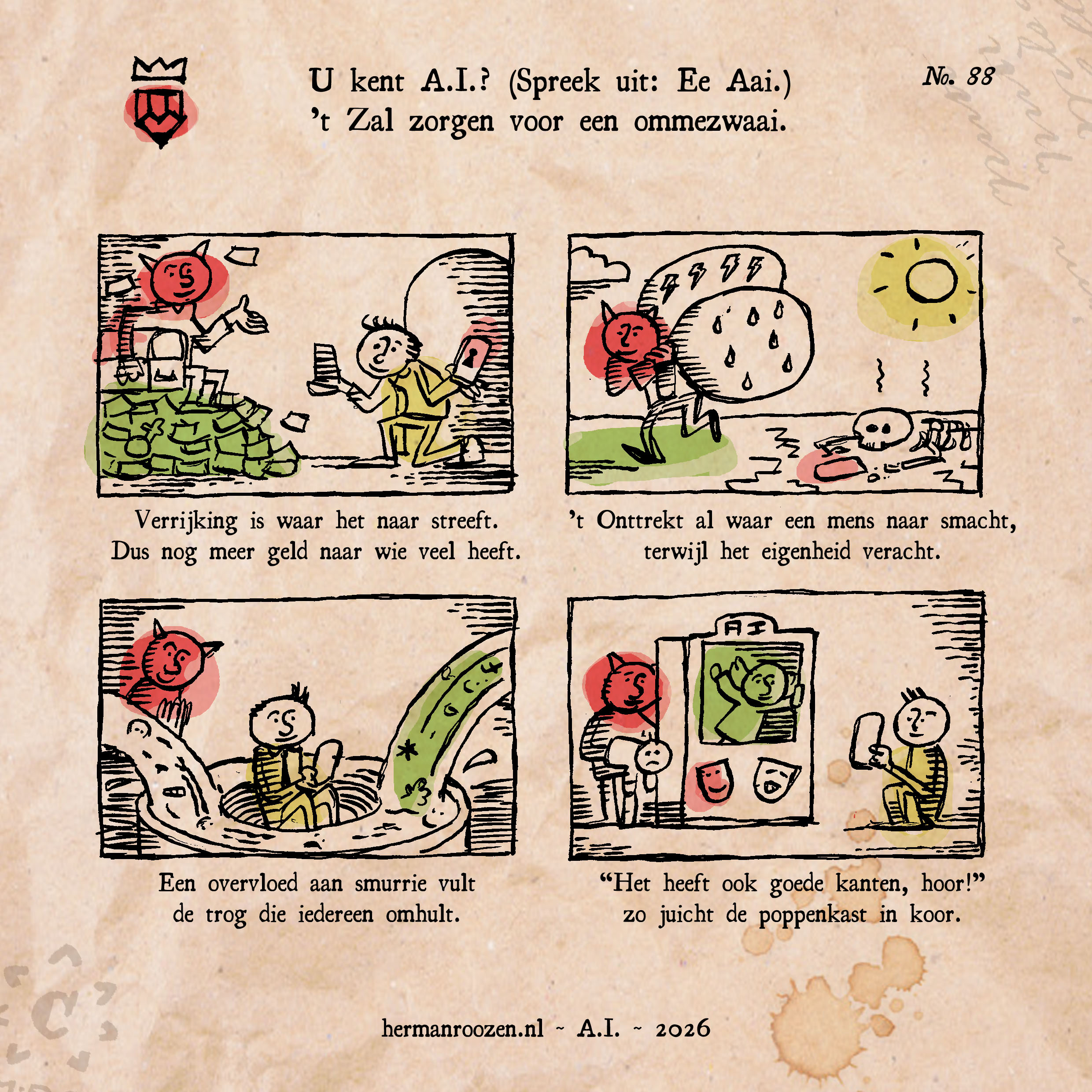 Wat me brengt op bagger. Ik maakte impulsief een centsprent over A.I., waarbij ik de producten die A.I. voortbrengt ‘bagger’ noemde. Een oplettende lezer op LinkedIn vond dat onaardig ten opzichte van bagger. Dus daarom plaats ik hier een nieuwe versie waarin de bagger is vervangen door smurrie.