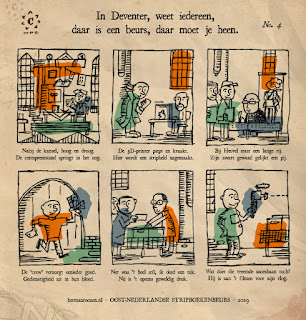 Aanstaande zaterdag ben ik op het Kamper Stripspektakel. Daar ga ik samen met nietsvermoedende voorbijgangers een centsprent maken. Als ik tijd over heb maak ik er zelf nog eentje naar aanleiding van wat ik zoal zie. Bijgaande prent maakte ik tijdens de beurs in Deventer.