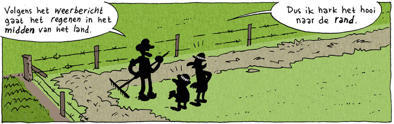 Ik zit ondertussen al heel wat jaartjes in het vak, beste mensen, maar lezers kunnen mij nog altijd verrassen. Onlangs maakte ik een aflevering van Opa, gebaseerd op de oude mop van de boer die zijn hooi naar de rand van het perceel harkt omdat het weerbericht zegt dat er regen komt in het midden van het land. Dit is het tweede plaatje, van vier.
