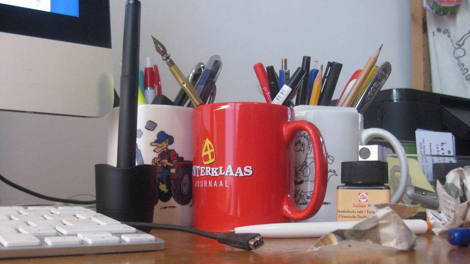 Voor het tweede jaar op rij heb ik mee mogen schrijven aan het grote verhaal van het Sinterklaasjournaal. Gisteren was de wrap up party (moet dat niet inpakfeest zijn?) en kreeg ik een fraaie beker mee naar huis. Dat kwam goed uit, want de beker van Opa en de beker van Monstertocht raakten aardig vol met pennen en potloden en allerlei ander gerei dat ik ooit nog denk nodig te hebben.