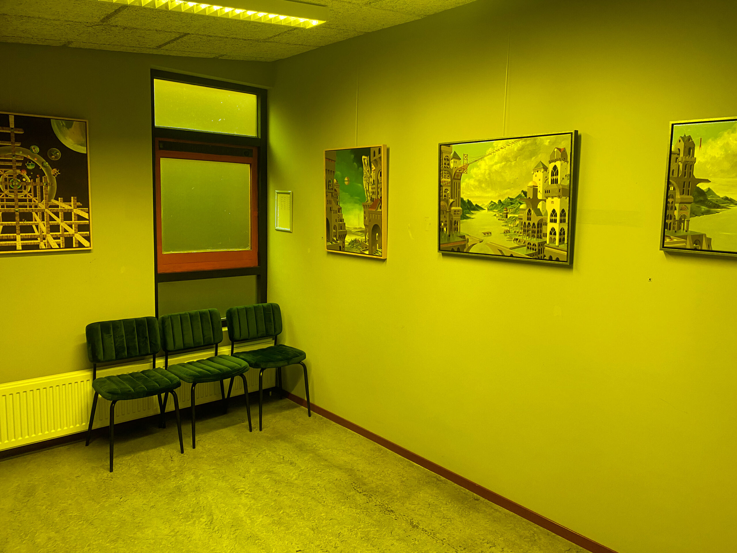 Aan mij de taak om er voor te zorgen dat er twee keer per jaar wat komt te hangen van iemand. Daar gaat nog wel wat aan vooraf. Eerst moet de ruimte nog een opknapbeurt krijgen. Ik ben van zins om de muren mosterdgeel te verven. In bijgaand plaatje heb ik dat gedaan met behulp van Photoshop. Die stoelen mogen er uit. Misschien het raamkozijn zwart en iets verzinnen voor de radiator.