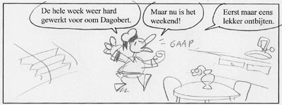Wat gaat u doen in de kerstvakantie? Misschien kunt u een bezoekje brengen aan Het Nederlands Stripmuseum in Groningen. Daar is nu de expositie Donald Duck weekblad 60 jaar te zien. Ik heb goed gekeken of er nog iets van mijn werk voor Donald Duck terug te vinden is in de expositie, maar ik heb niks kunnen vinden. Daarom hierna het eerste plaatje uit het meest recente aangekochte Donald Duck-verhaal dat ik geschreven heb: Paardenrace. Ooit zal dat een keer verschijnen in het vrolijke weekblad.
