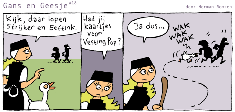 Perdiodiek maar volkomen onregelmatig maak ik strookjes Gans en Geesje. ’t Is maar net of er iets gebeurt in gemeente Coevorden dat mijn aandacht trekt. In dit geval was er een gebeurtenis die mij persoonlijk in de portemonnee raakte, en dan is een strip snel gemaakt. Onze jongste wilde dolgraag Nielson een keer live zien. Dat leek te kunnen tijdens VestingPop. De rest van het programma interesseerde hem (en mij) niet zo. Toch maar twee kaarten aangeschaft van 29,50 euro (+2,50 servicekosten) per stuk. Een paar dagen later bleek dat het evenement niet door ging, en nog weer een paar dagen later bleek dat de organiserende BV van de heren Strijker en Eeftink failliet was. Geen evenement, en geen geld terug.