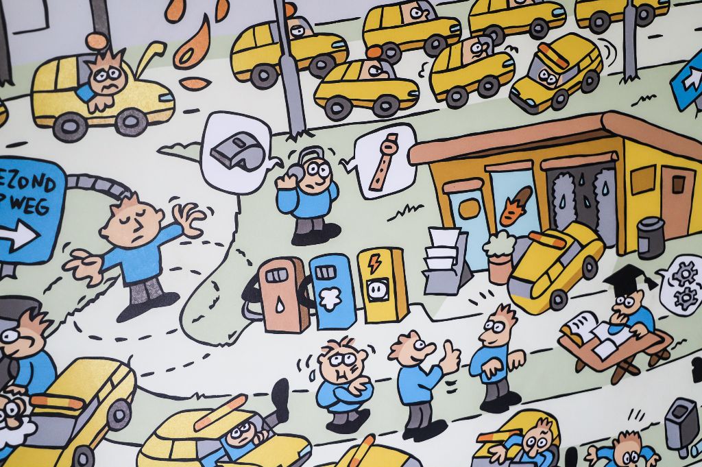 Dat doe ik thuis vanachter mijn bureau, of op locatie bij congressen en vergaderingen, of voor de klas. Mijn tekenstijl omschrijf ik zelf als “Meer Bruna dan Poortvliet”. (Waarna ik soms moet uitleggen wie Poortvliet is.) Zowel mijn tekeningen als mijn verhalen hebben wel een gemeenschappelijk kenmerk: ze bevatten humor.