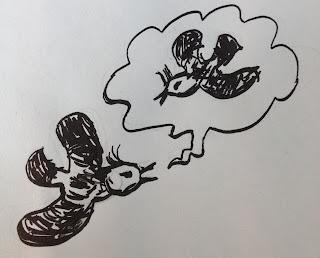 Het is bijzonder aangenaam om zo nu en dan eens een woordloos stripverhaal te kunnen maken. De eerstvolgende aflevering van Opa is er zo een. Helaas niet helemaal woordloos, want er komt een onomatopee in voor (KLIK), en vogelgeluiden. Bij het tekenen schoot me wel te binnen dat de heersende opvatting is dat de kievit (Vanellus vanellus), zijn eigen naam roept. Daar had ik dus kunnen kiezen voor een tekening van een kievit in een tekstballon.