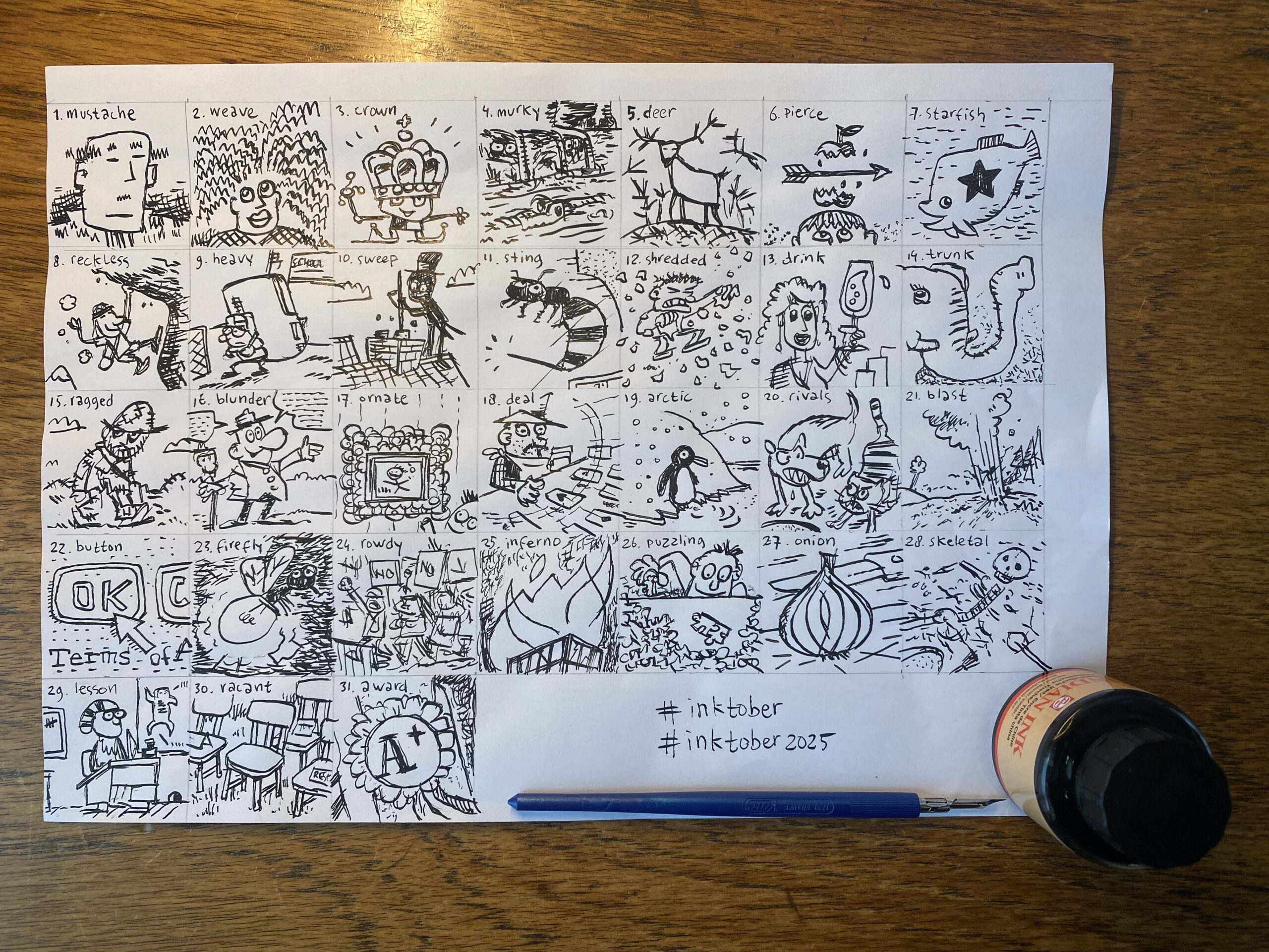 Oktober is voorbij, en daarmee ook #inktober, de jaarlijkse teken-uitdaging. Bijgaand mijn 31 tekeningen. En hierboven nog een live cartoon. Toevallig(?) mag ik de eerste dagen van november heel veel op locatie tekenen. Gisteren was ik in Mariënvelde, de komende dagen mag ik nog naar Tilburg, Ankeveen en Doetinchem.