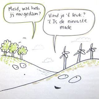 De cartoon hiernaast is opgetekend tijdens een bijeenkomst over energielandschappen. Wat is de invloed van de energiebehoefte (van de mens) op het landschap? Vroeger waren dat gaten in de grond, in de toekomst zijn dat andere dingen.