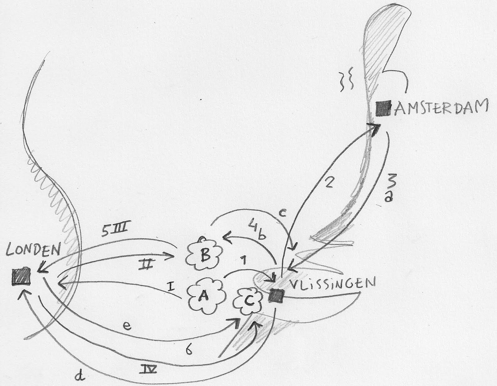 Heldt van Hollandt speelt zich af op zee en in drie steden: Vlissingen, Amsterdam en Londen. Om de bewegingen van drie van de hoofdpersonen te visualiseren heb ik onderstaand kaartje gemaakt.