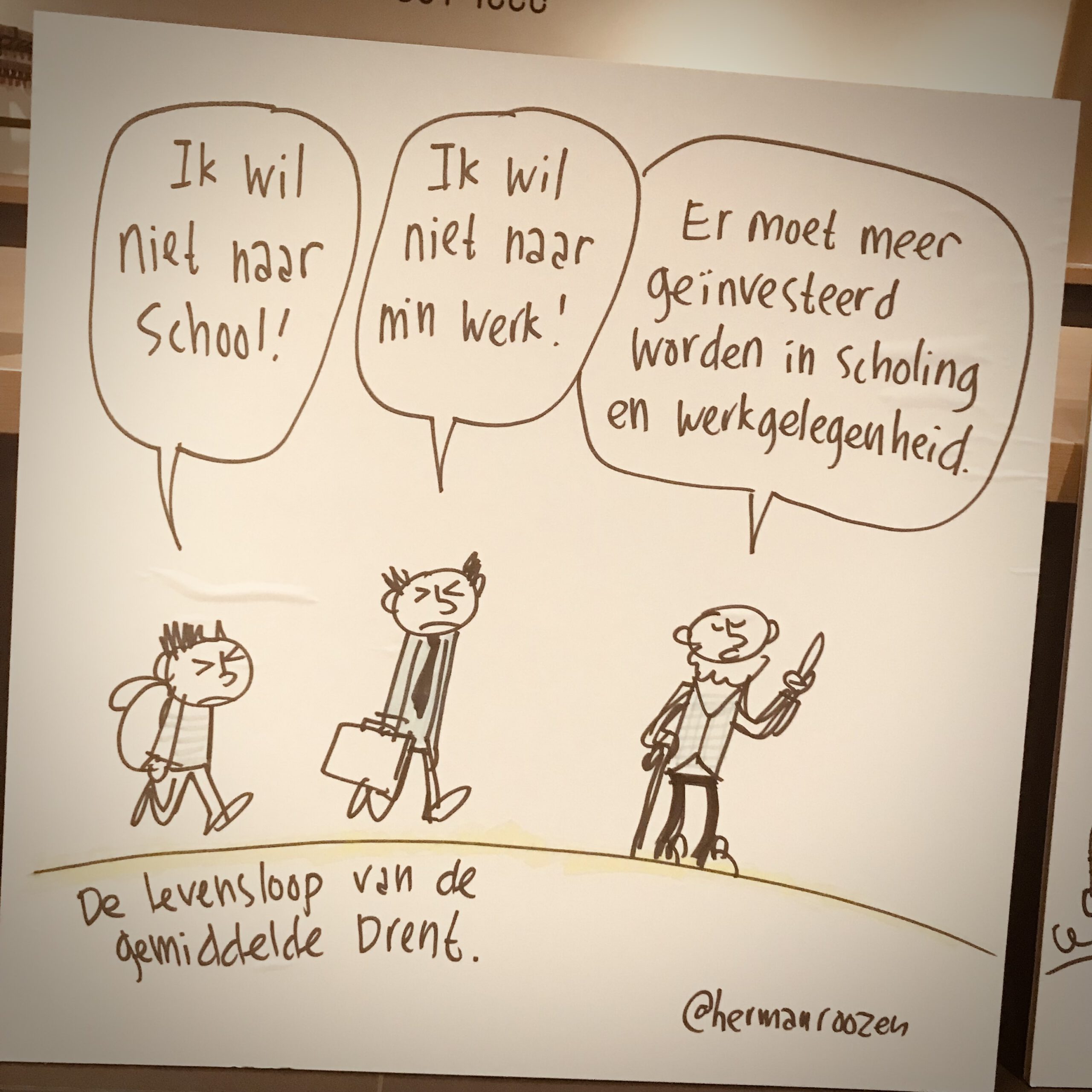 Live tekenen in een theater is toch wel het leukste. Goed licht, goed geluid, goed zicht voor het publiek. Dat helpt allemaal mee bij het lachers op je hand krijgen. Plus grappige cartoons met dito uitleg natuurlijk. Vandaag was ik voor de tweede (van vier) keer aan het werk voor de provincie Drenthe. In het Atlas-theater in Emmen. Een handvol cartoons van de vorige keer hadden ze keurig gescand en afgedrukt op foamboard. Deze vond ik de vorige keer het leukste.