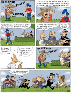 Vandaag is het op de kop af 16 jaar geleden dat ik voor het eerst een aflevering Opa tekende. Dat is niet de bijgaande aflevering. Die is verschenen ten tijde van het rondwaren van de Mexicaanse griep. Wat vooraf ging: Op de boerderijcamping van Opa zijn door een samenloop van omstandigheden de controleurs, de dokter en de bankdirecteur komen kamperen. Eerst speelden ze nog klaverjas, maar in het vierde plaatje spelen ze Pandemie. Hoe toepasselijk.