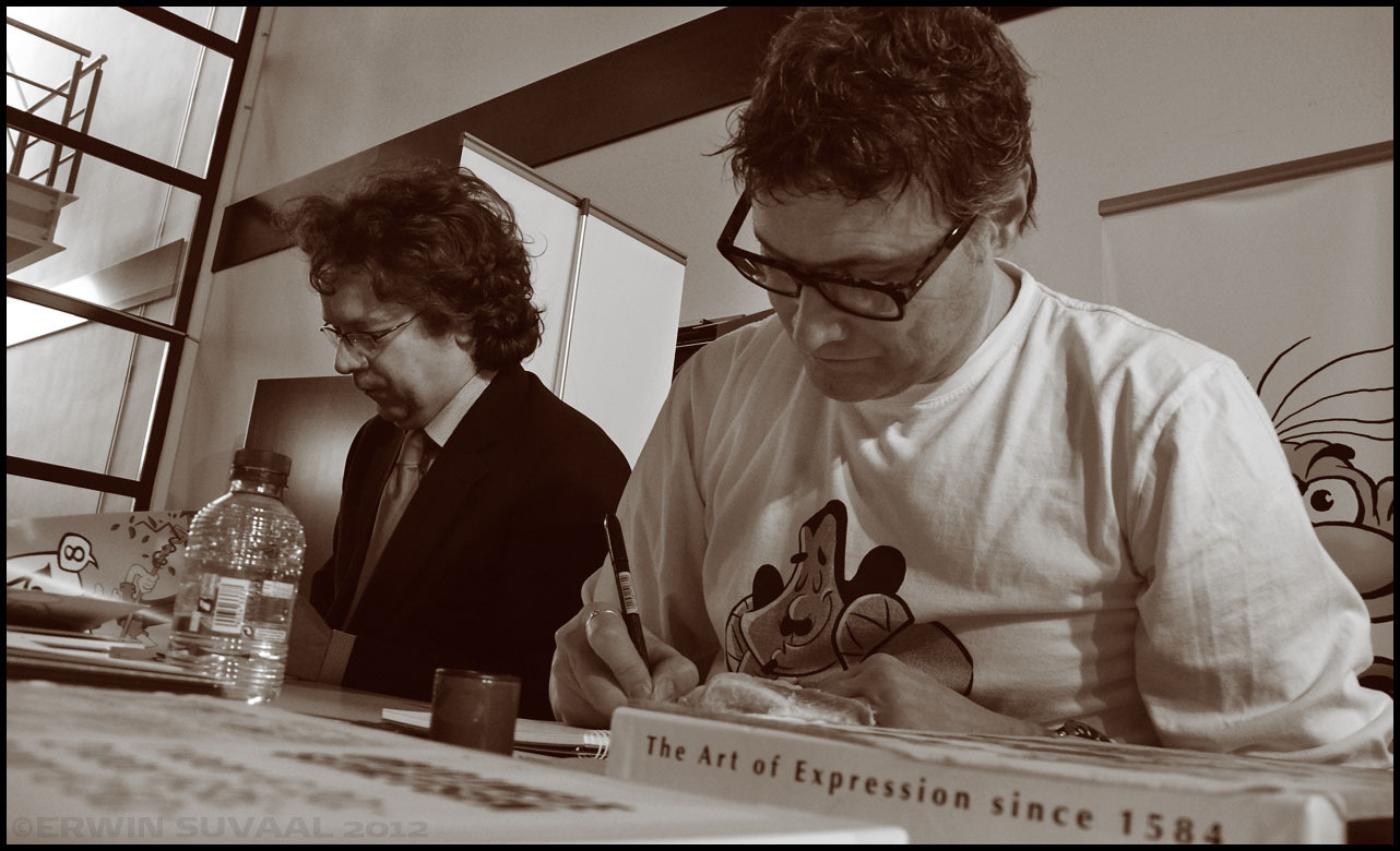 Afgelopen weekend was ik op de Stripdagen in Gorinchem. Dat wil zeggen: alleen op zondag. En dat wil zeggen dat ik alleen tussen 10 en 12 uur in de Eppo-stand tekeningen heb gemaakt. Aldaar maakte Erwin Suvaal onderstaande twee foto’s.