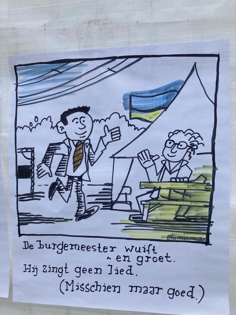 Een slordige vijf jaar geleden maakte ik tijdens het bevrijdingsfestival in Assen in plaats van live cartoons live centsprentjes. Op een groot vel papier een tweeregelig rijm met een tekening. Zo ook eentje van de burgemeester.