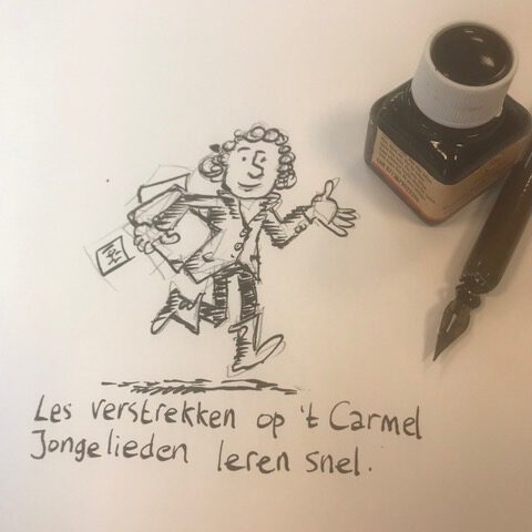 Deze vorm was een experiment, maar heb ik ondertussen vaker toegepast. En ga ik vaker toepassen. De gelijkenis met de persoon is zelden heel treffend – dat is nu eenmaal niet mijn sterkste kant – maar met het rijmpje en wat omgevingsbeeld wordt het toch nog wat. Plus het feit dat het ter plekke gemaakt wordt.