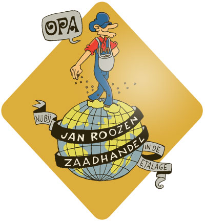 Eén van de projecten in Haarlem is Zichtbare Lijnen. Een hele stoet aan stripmakers verzorgt werk voor een heel stratenplan aan etalages. Ik lever tekeningen en strips van Opa voor in de etalage van Zaadhandel Jan Roozen (geen familie) aan de Spekstraat. Ik heb ook nog speciaal een variatie op hun logo getekend.