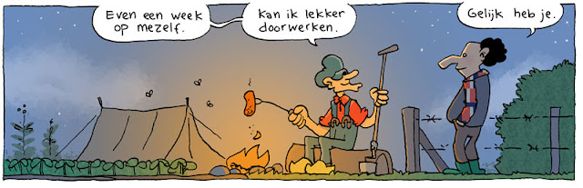 In de zomermaanden maak ik wel vaker meerdere afleveringen van Opa die een beetje op elkaar aansluiten. Vorig jaar ging hij op vakantie met een caravan. Dat was dan weer de caravan waar hij in zat omdat het huis onbewoonbaar was verklaard. Zo lokt het ene verhaaltje het andere uit. Ik heb ook al eens een reeksje gehad over een groepje stuntelende stagiaires uit alle windstreken, en over Cooyman, de directeur van de CooBank, die een tijdje mee kwam helpen. Dit soort reeksen zijn ongepland, en leuk om te doen. Als ik dan de lopende verhaallijn weet te combineren met een actueel onderwerp, dan is mijn week weer goed.