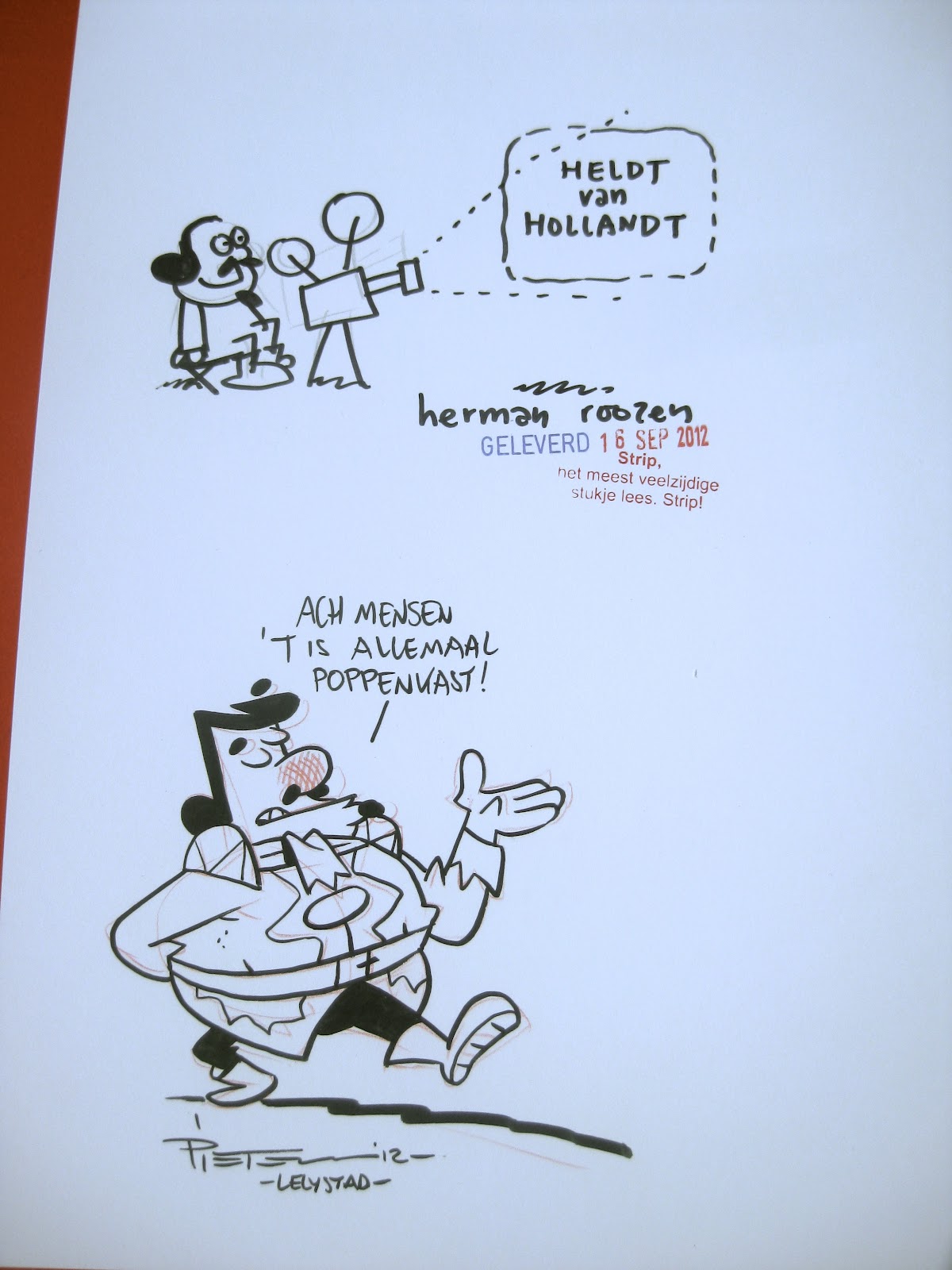 De albums van De Ruyter vliegen als warme kanonskogels over de toonbank. Afgelopen zondag mochten we er eentje overhandigen aan de directeur van theater Agora in Lelystad. Elk album krijgt een tekeningetje mee, indien mogelijk en wenselijk gepersonaliseerd. In onderstaande tekening kijkt de admirael naar de film Heldt van Hollandt. Wie weet gaat deze rolprent ook nog eens in Agora draaien.