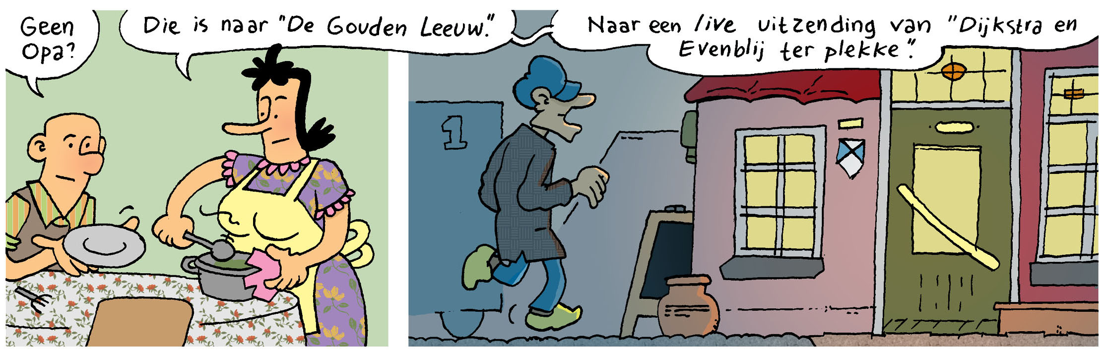 Het radioprogramma Dijkstra en Evenblij ter plekke streek neer in Coevorden en ik mocht een paar minuten aanschuiven. Het ging onder andere over de boerenprotesten en de Donald Duck. Het leek met name Dijkstra wel eens leuk om in Donald Duck te verschijnen. Een scenario waarin ‘Ei-stra’ en ‘Even-ei’ een radioprogramma maken vanuit Duckstad lijkt me niet onmogelijk. Maar ik heb maar beperkt onvloed op de gebeurtenissen in Duckstad. Wat er in Bovenscheveen gebeurt kan ik wel zelf regelen. Vandaar dat we in het eerstvolgende nummer van Boerderij zien hoe Dijkstra en Evenblij te gast zijn in De Gouden Leeuw.
