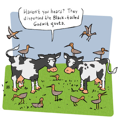 Over het algemeen zijn mijn cartoons voor éénmalig gebruik. Ze verschijnen in een tijdschrift of personeelsblad, en daarmee is de kous af. Een enkele keer wordt er eentje hergebruikt. En heel soms ook nog ’s in een ander taalgebied. Onderstaande cartoon over de grutto bijvoorbeeld.