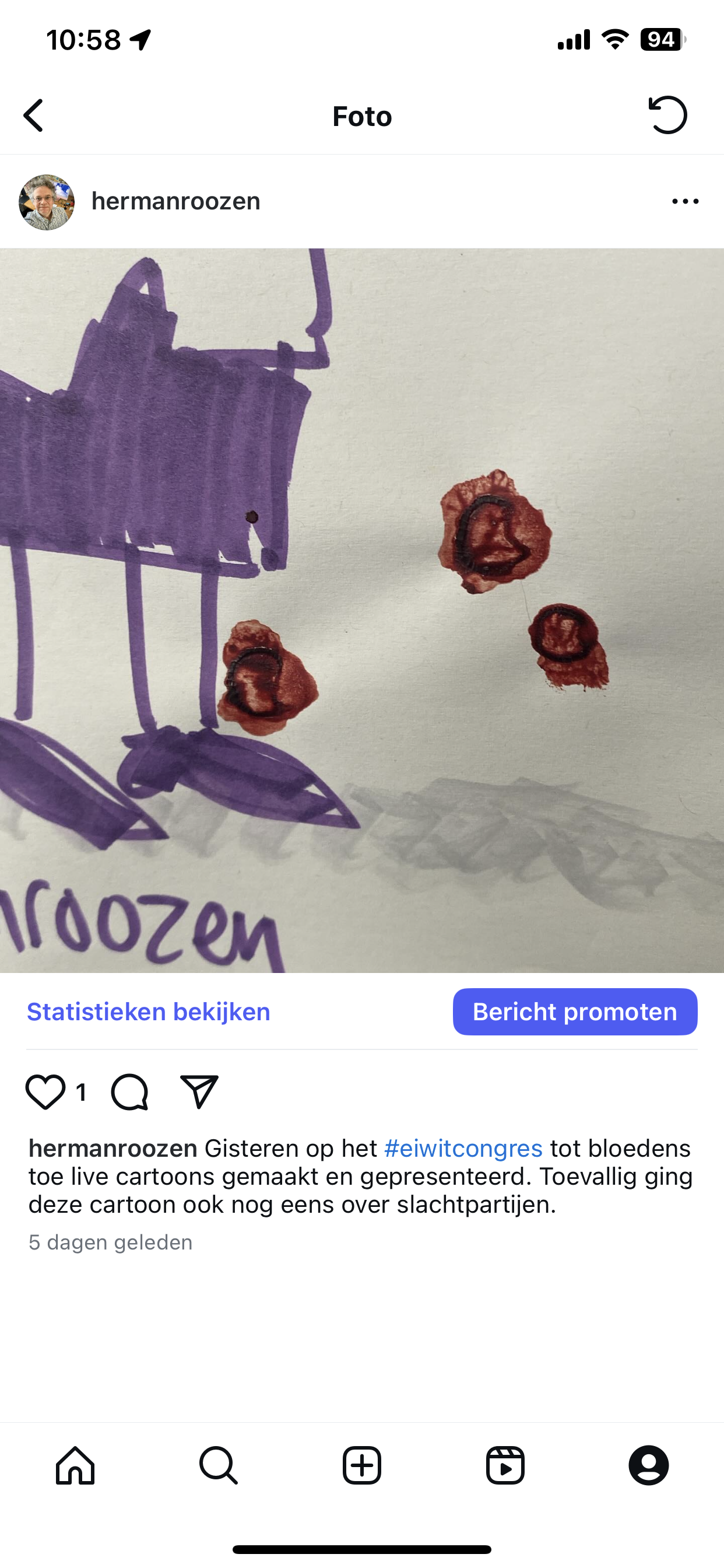 Vorige week mocht ik voor de tweede keer live cartoons tekenen en presenteren tijdens het eiwitcongres. Tijdens de presentatie ging er iets mis: ik sneed mijzelf aan het papier. Dat scheur ik altijd met een nonchalante beweging los, en dat ging niet helemaal goed. Ik moest nog een stuk of tien cartoons laten zien, dus ik kakelde vrolijk verder, maar een deel van het publiek trok bleek weg. Er kwam meer bloed bij kijken dan ik dacht. Op bijgaand plaatje (een schermafdruk van Instagram) ziet u dat het zelfs op een cartoon druppelde.
