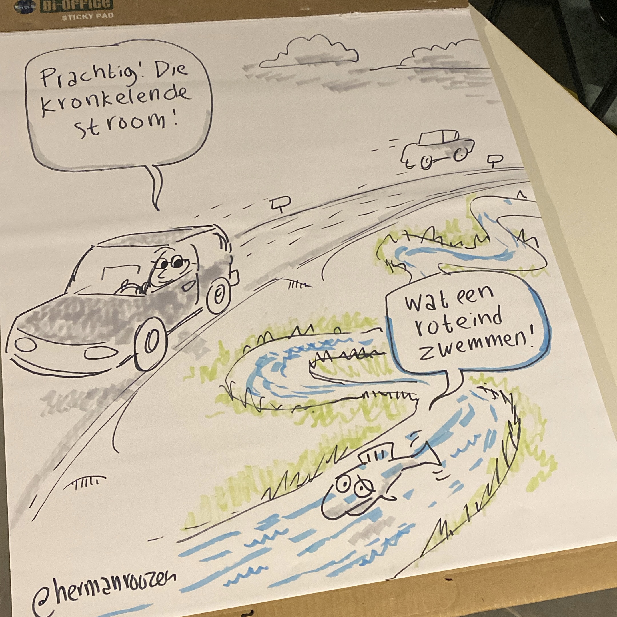De afgelopen twee dagen heb ik weer heel wat van de wereld gezien. En met de wereld bedoel ik de (routes van en naar) Almelo, Amsterdam en Utrecht. In Almelo maakte ik bovenstaande cartoon. Bij binnenkomst (per auto) in de stad viel het me op dat de wegen kaarsrecht en de stromen kronkelend waren. De dieren een stem geven is dan een vrij eenvoudige manier om humor in een situatie te ontdekken.